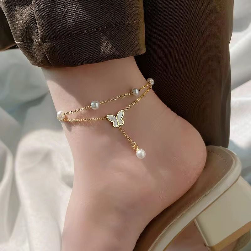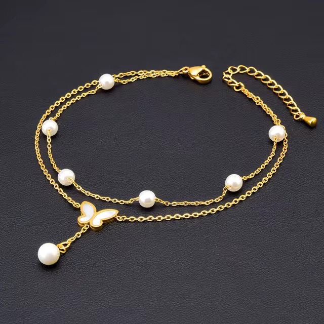 SJ 710 Butterfly Double layer Dangling Anklet - 18k Gold PVD plated stainless steel - Anti tarnish